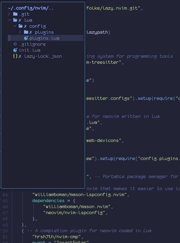 So imagine that you have some cool plugin set up to run when you hit a key. You don’t really need to load the plugin until you hit that key, right? What lazy.nvim makes it easy to do is setup functions to load when certain actions happen, like when a file of a certain type is loaded, or when you hit a certain key combination, or when you use one of the functions that it uses. There are a lot more options that I haven’t gotten into, but I would say my favorite is “VeryLazy.” VeryLazy doesn’t wait until a specific event, but wont stop the editor from loading, and will just load it later. This is really useful for more minor UI stuff, or if you just can’t figure out when something should load.