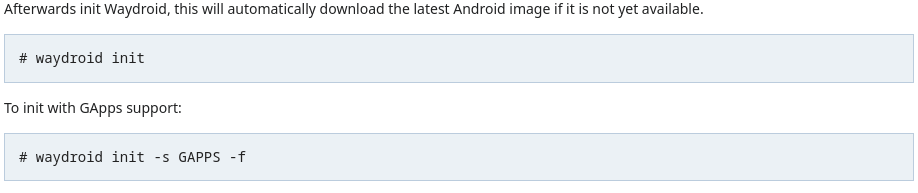 First of all, I installed the package with sudo dnf install waydroid. I decided to use the Arch Wiki page for advice. It gave the following commands:
